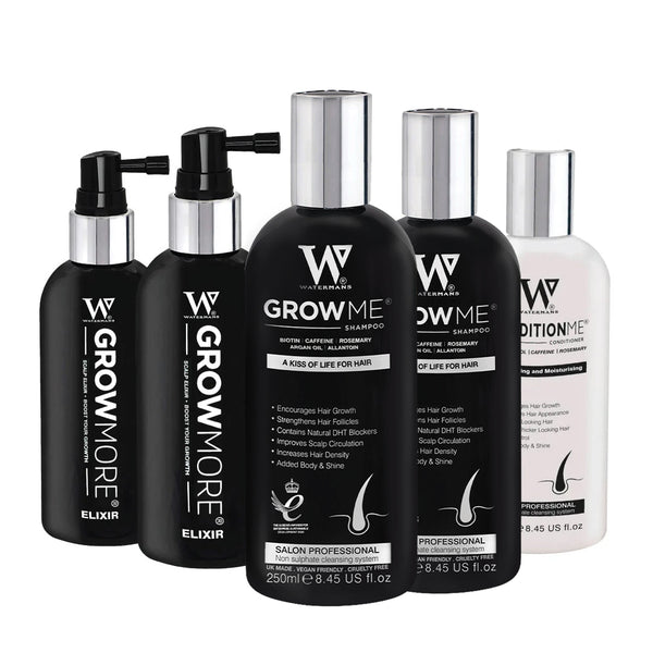 باقة تكثيف الشعر الجاف 3 شهور 2x Grow Me shampoo + 2x Grow More Elixir + 1 Conditioner محتويات باقة تكثيف الشعر الجاف 3 شهور عبوتين من شامبو جرومي شامبو...