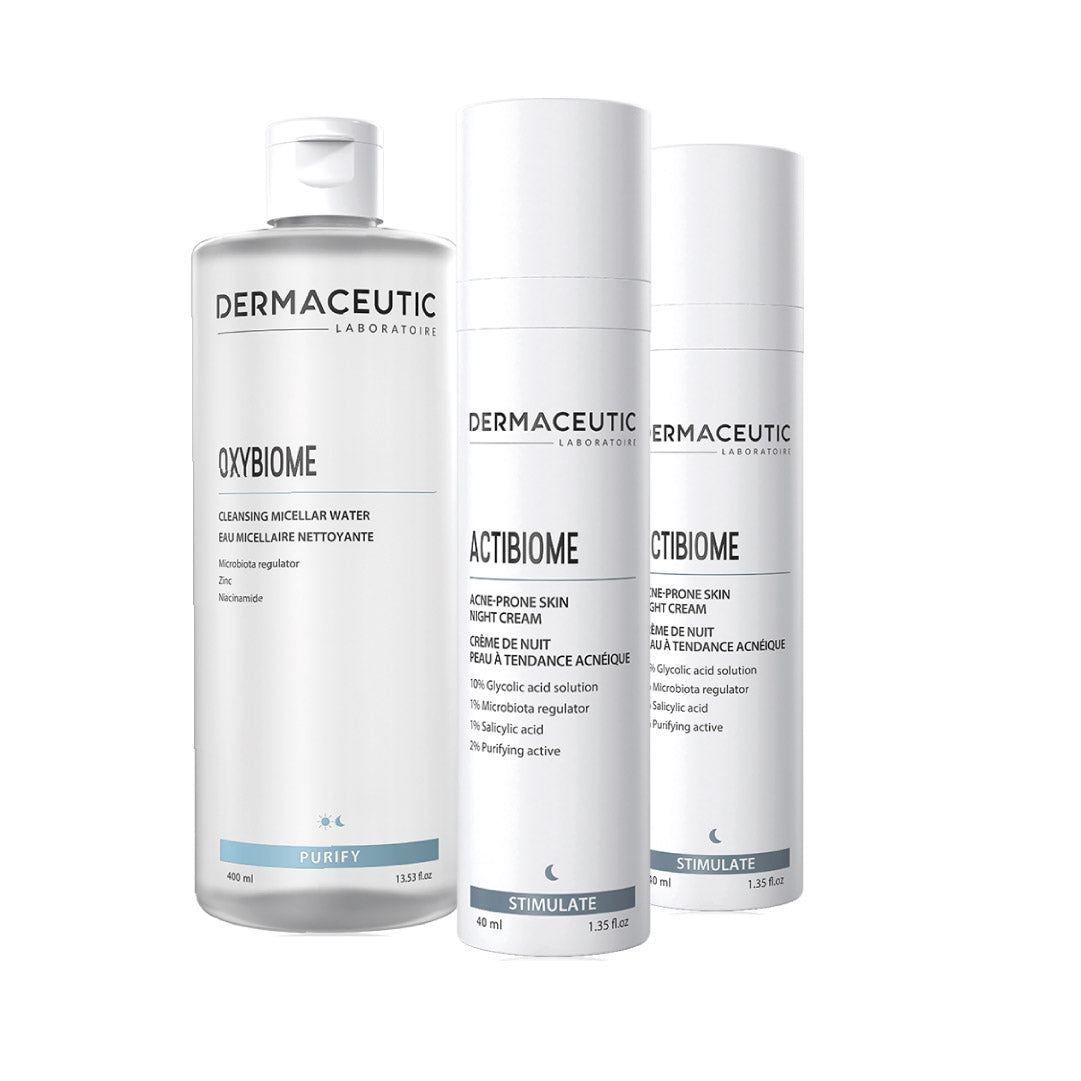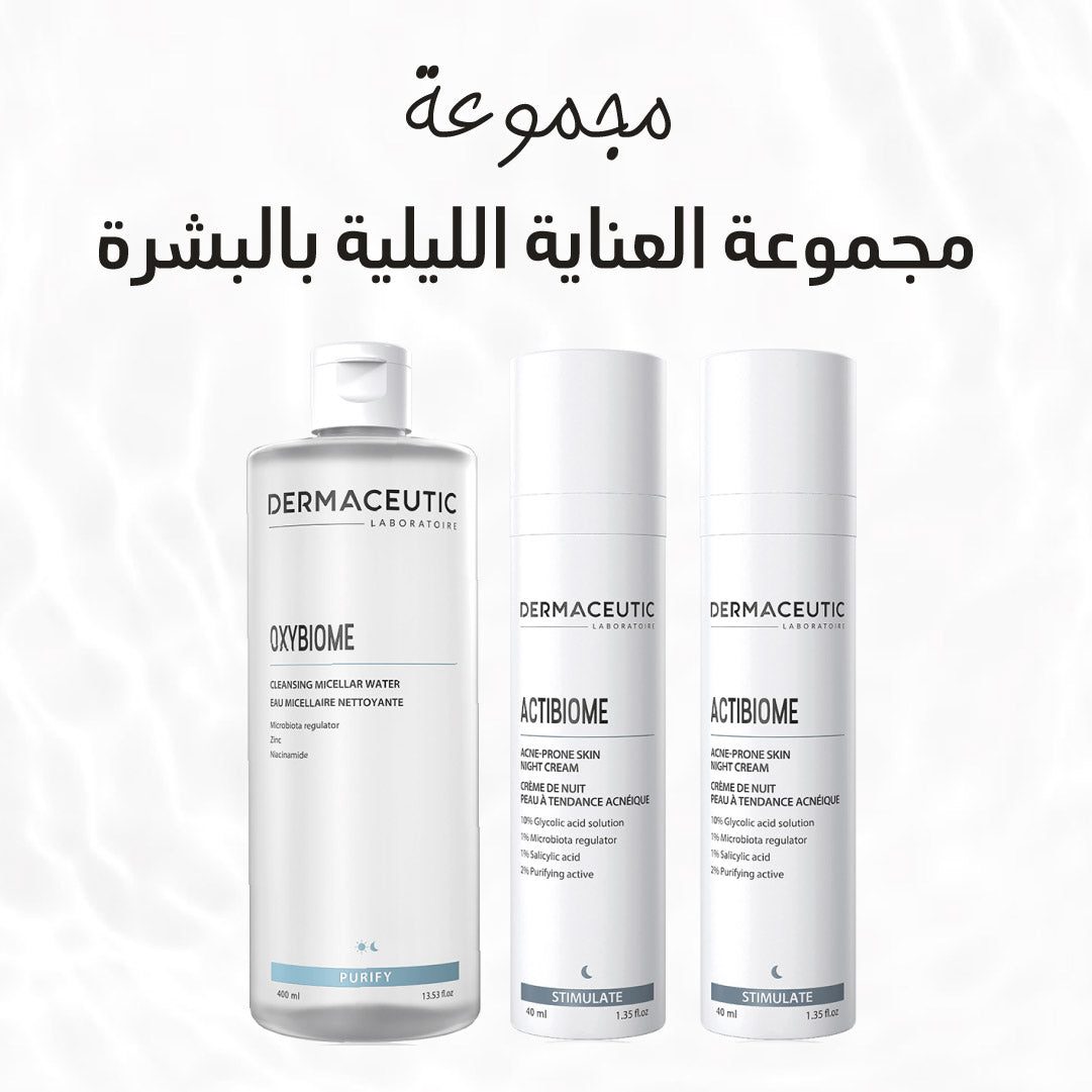 تحتوي هذه المجموعة من شركة ديرماسيوتيك الفرنسية على منظف للوجه ومزيل مكياج، وكريم العناية الليلية للحد من حب الشباب وتخفيف آثار التصبغات، وهما