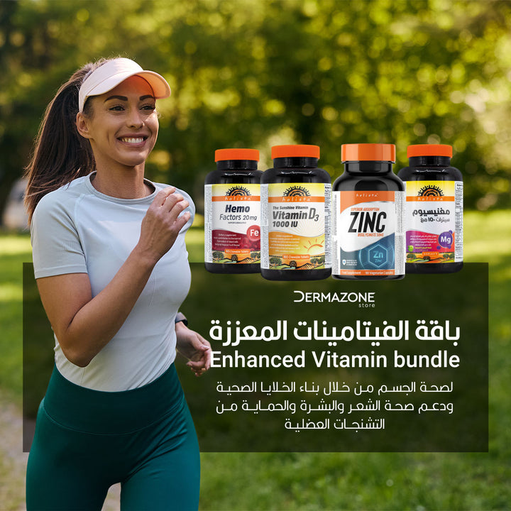 تحتوي هذه الباقة على أهم الفيتامينات المعززة لصحة الجسم من خلال بناء الخلايا الصحية ودعم صحة الشعر والبشرة والحماية من التشنجات العضلية، تحتوي هذه الباقة على كلًا مما يلي.
