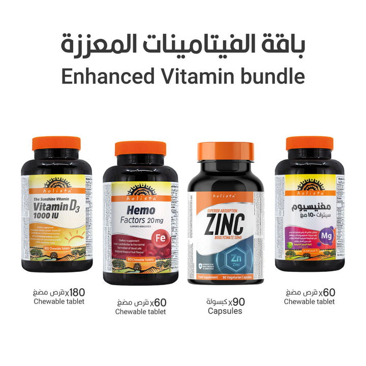 • 1000 وحدة دولية من فيتامين د من هوليستا بتركيز عالى له دور  أساسي في الحفاظ على صحة العظام والأسنان ويدعم امتصاص الكالسيوم والفوسفور في الجسم كما يدعم صحة جهاز المناعة والصحة العامة، يأتي على شكل أقراص مضغ خالية من الجلوتين ومصنعة من المواد الحافظة والألوان الصناعية.