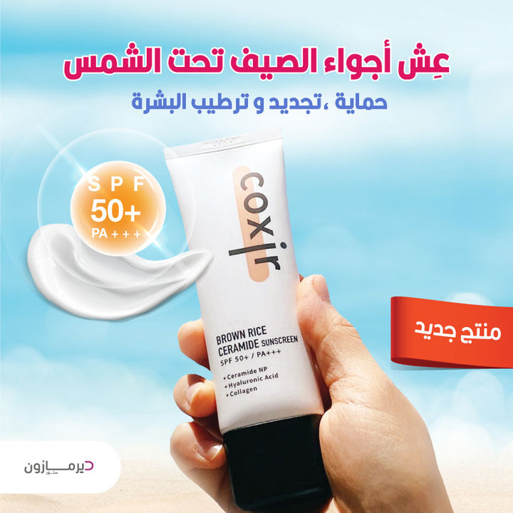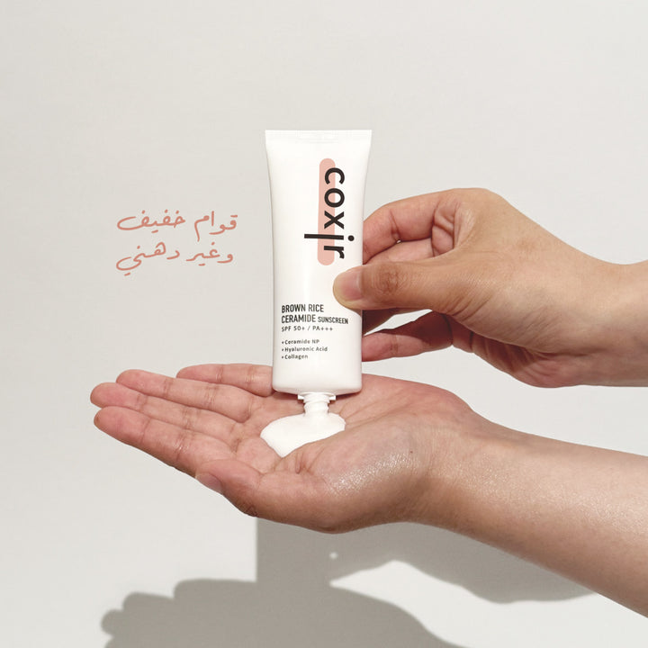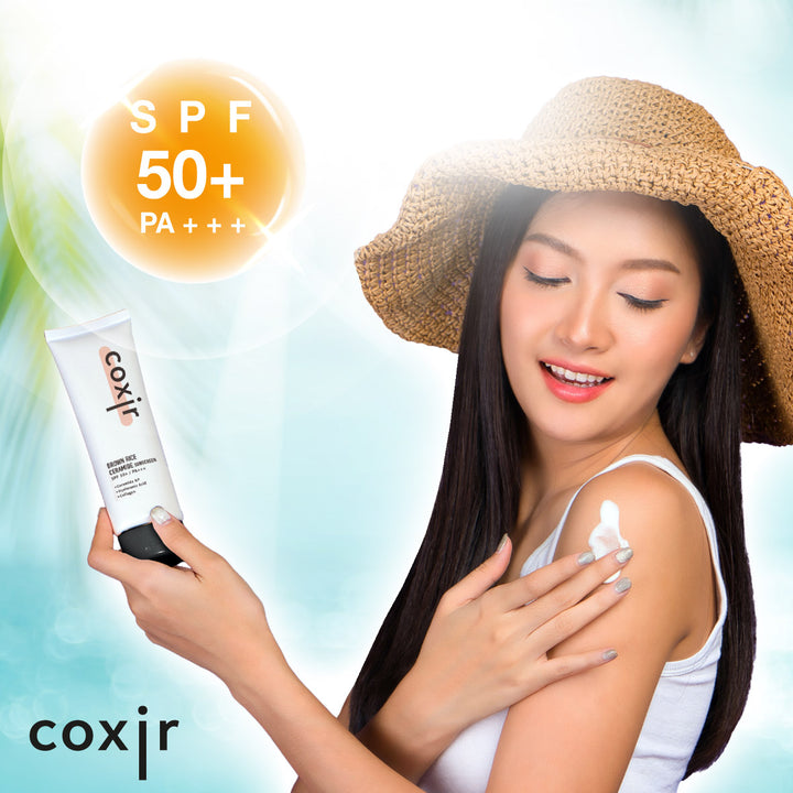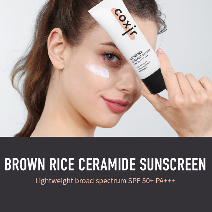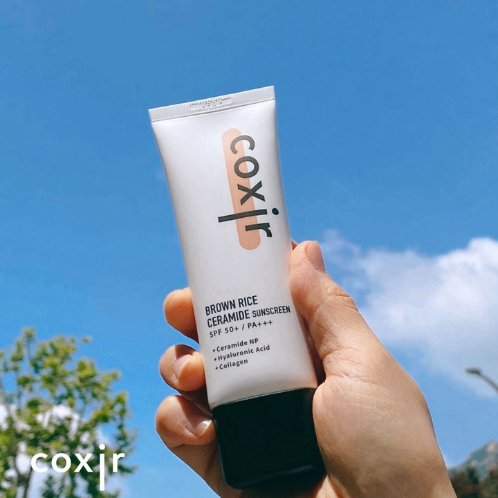 Coxir's brown rice ceramide sunscreen provides SPF 50+ maximum protection against harmful sun rays while deeply nourishing the skin. This sunscreen contains hyaluronic acid, ceramides, and brown rice extract, working together to renew and protect the skin.