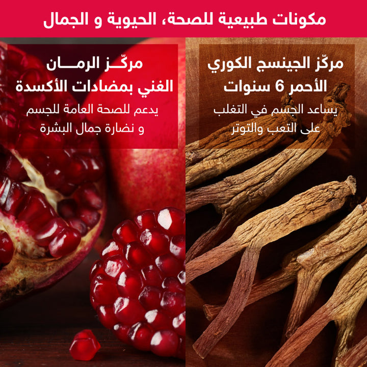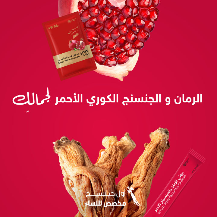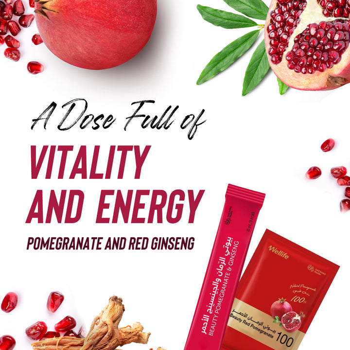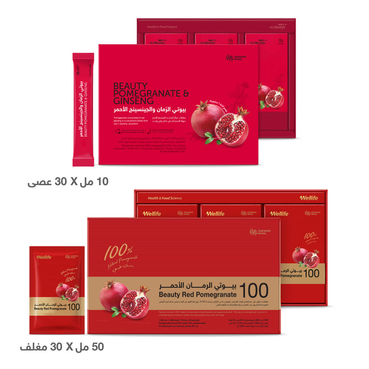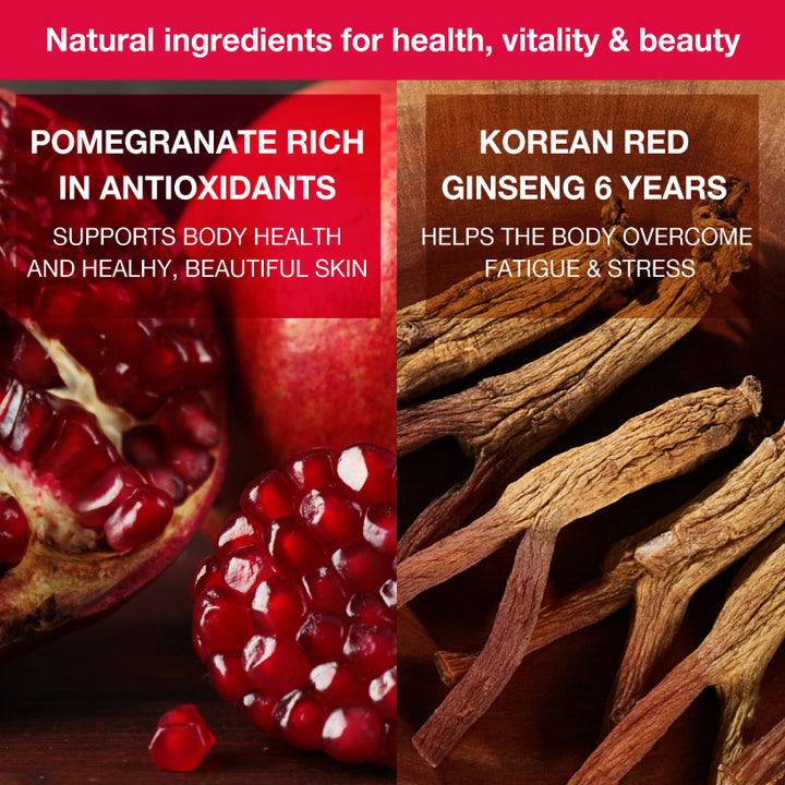 1. Korean Red Pomegranate & Ginseng Box (10ml x 30 packs): Combines the antioxidant power of pomegranate with Korean red ginseng to combat free radicals, reduce stress, and support healthy skin cells.