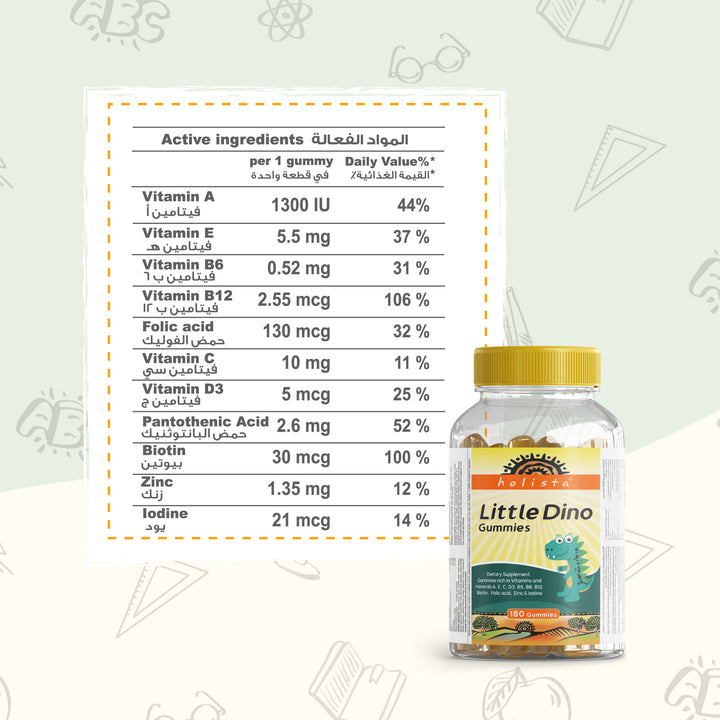 Little Dino Multivitamin Gummies provide a balanced blend of essential vitamins and minerals that support your child’s healthy growth and development. With delicious orange, berry, and lemon flavors, these gummies are designed to help maintain healthy skin, vision, and immune function. Rich in vitamins A, C, D3, and B-complex, they also contribute to bone and teeth health, while supporting the body’s absorption of nutrients.