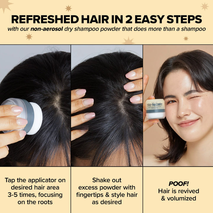 The dry shampoo comes in a fine powder form stored in a small container, accompanied by a soft sponge for precise application on the hair.