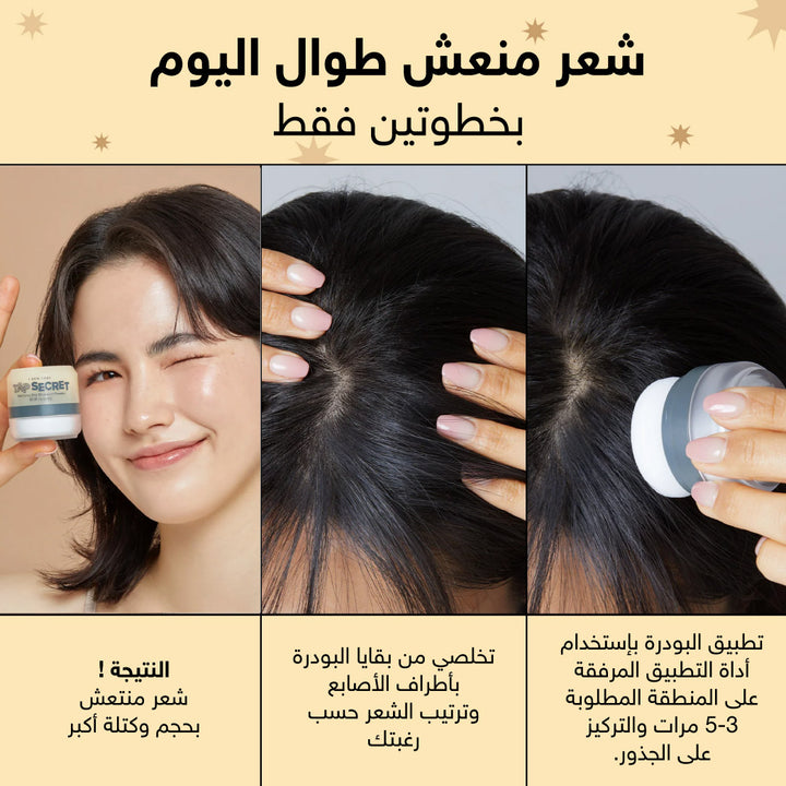 Apply the powder using the included applicator tool to the desired area 3-5 times, focusing on the roots.