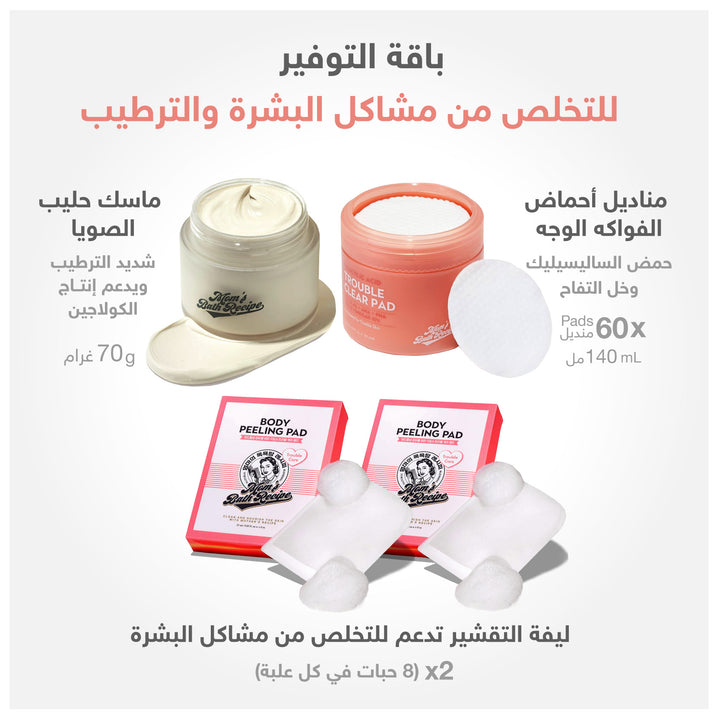 A complete skincare set designed to treat and hydrate both the face and body. This set includes two packs of "Trouble" exfoliating body mitts, a pack of fruit acid cleansing wipes for the face, and a hydrating soy milk mask.