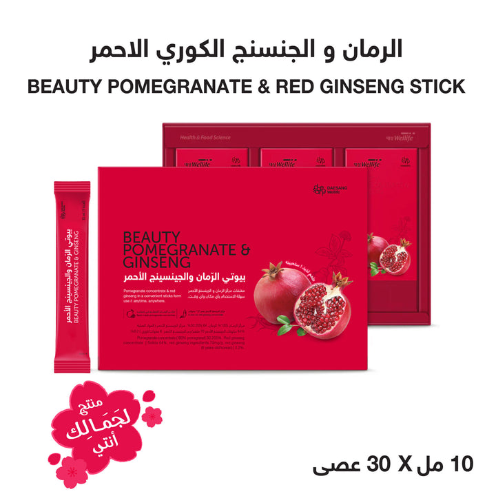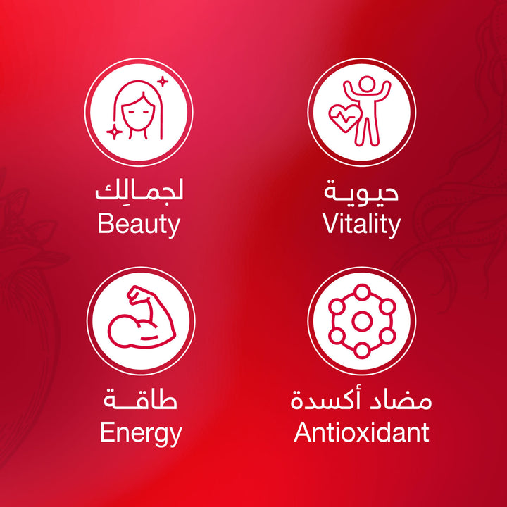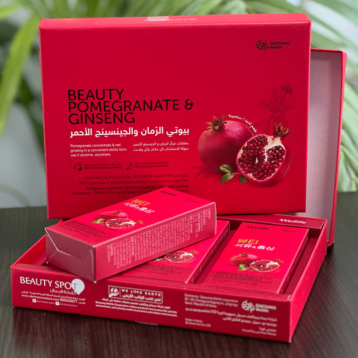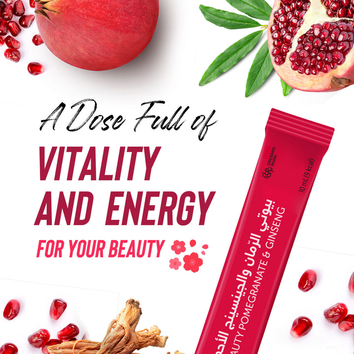 يعد هذا الشراب بنكهة الرمان مكملًا غذائيًا يدعم الجسم بمضادات الأكسدة الطبيعية وخصائص عديدة تساعد على تقوية الجسم وتنشيطه بالإضافة إلى تأثيره الفعّال على صحة البشرة؛ لاحتوائه على خلاصة الرمان الطبيعي الغني بمضادات الأكسدة والداعم لصحة القلب و الجنسنج الأحمر الكوري الغني بخصائص تقوي الجسم تجاه التوتر والتعب.