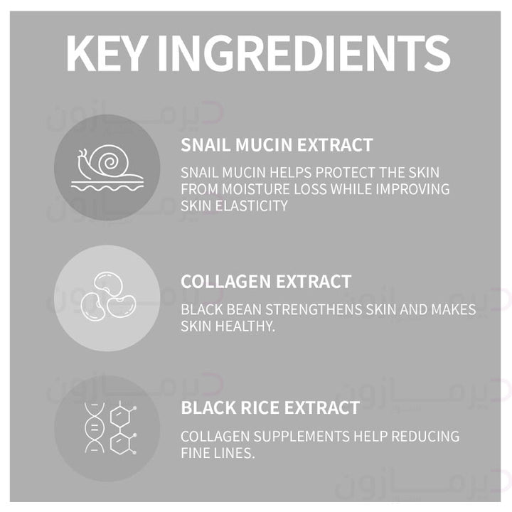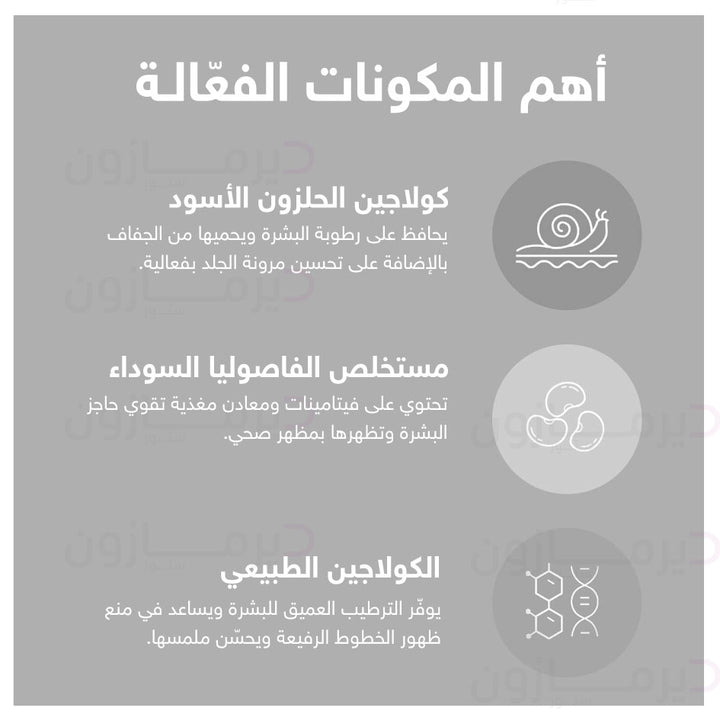 - كولاجين الحلزون الأسود: يحافظ على رطوبة البشرة ويحميها من الجفاف بالإضافة على تحسين مرونة الجلد بفعالية.