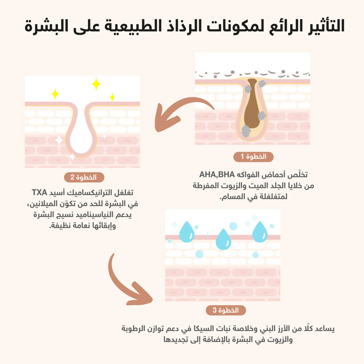 يساعد كلًا من الأرز البني وخلاصة نبات السيكا في دعم توازن الرطوبة والزيوت في البشرة بالإضافة إلى تجديدها.