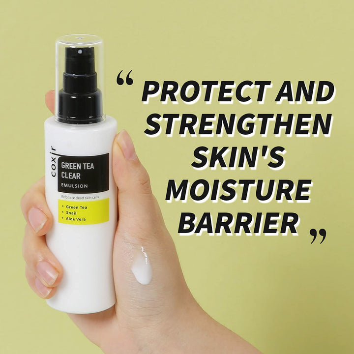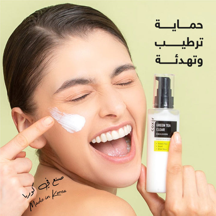 يوفر مستحلب الشاي الأخضر العناية الفائقة لكافة أنواع البشرة خاصة المعرضة لحب الشباب؛ إذ أنه يوازن مستوى الزيوت والماء في البشرة بالإضافة إلى خصائص تنعيم سطح الجلد.