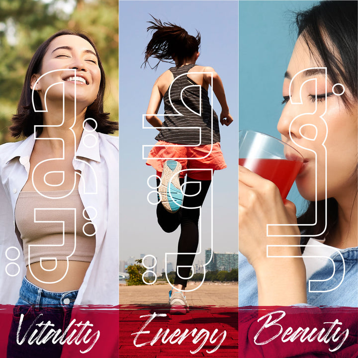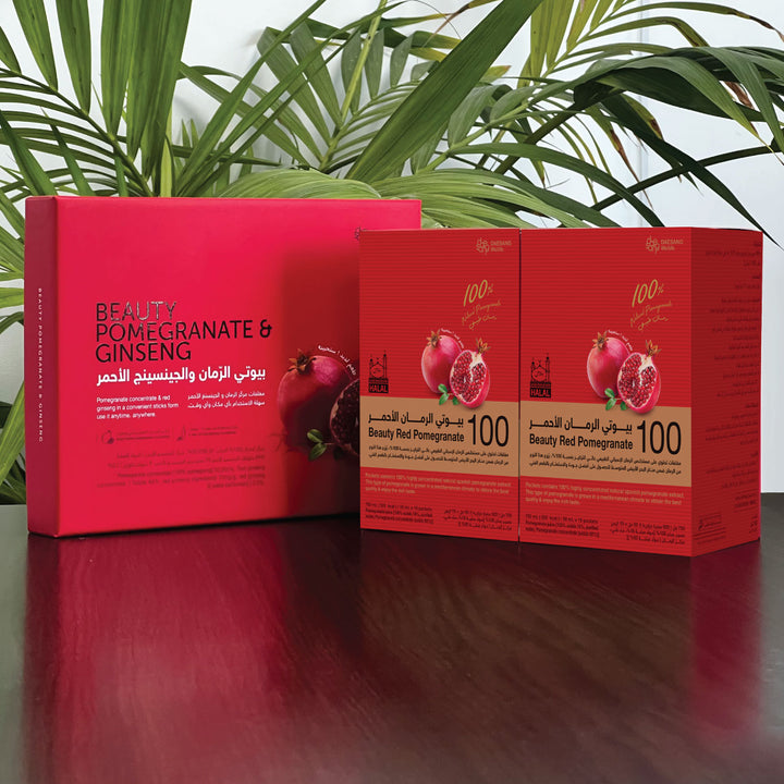 يدعم الرمان والجينسينج الكوري الأحمر الجسم بالعديد من مضادات الأكسدة الطبيعية الموجودة في الرمان ونبات الجنسنج مما يحارب الجذور الحرة الضارة المسببة تلف خلايا البشرة بالإضافة إلى تهدئة الجسم والتصدي للتوتر والإجهاد الذي له دور كبير في إلحاق الضرر بالبشرة.