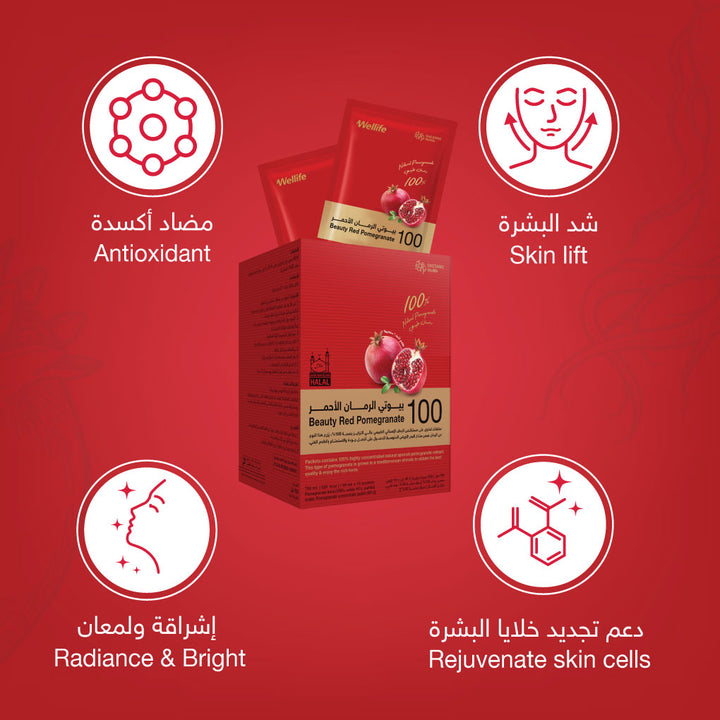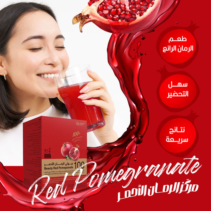 يدعم عصير بيوتي الرمان الأحمر إنتاج الكولاجين في الجسم وتجديد الخلايا وترطيب البشرة للحصول على خلايا صحية جديدة تظهر إشراق ولمعان البشرة، كما أنه يساعد في التخلص من مشاكل البشرة الشائعة مثل حب الشباب والأكزيما وأعراض تقدم سن البشرة.