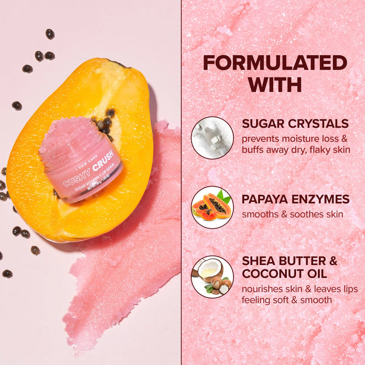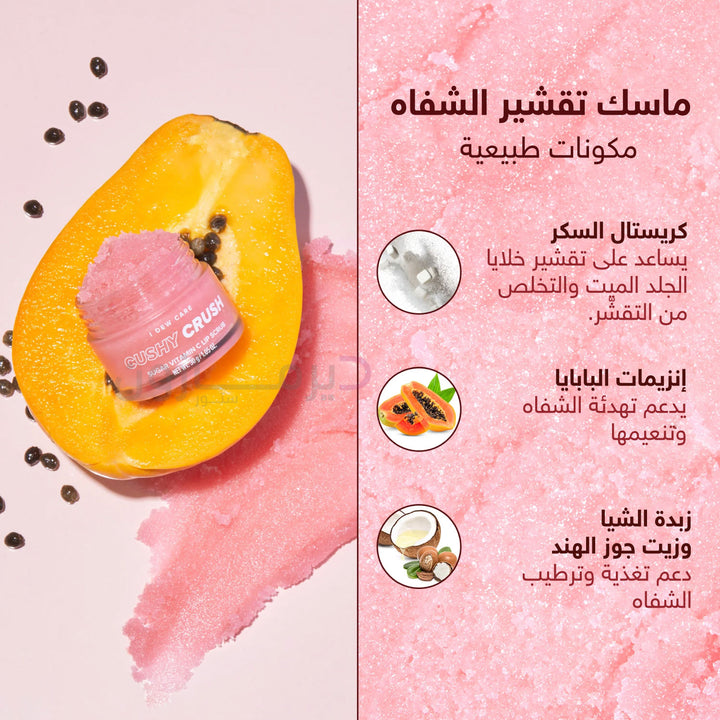 يتخلص ماسك تقشير الشفاه كاشي كراش من كافة خلايا الجلد الميت وتقشّر الشفاه الناتج عن الجفاف وإفراز اللعاب والمسبب لحدوث التهابات ومشاكل عديدة للشفاه؛ لاحتوائه على السكر الطبيعي وكلًا من إنزيمات البابايا وزيت جوز الهند وزبدة الشيا لتعزيز النضارة والترطيب.