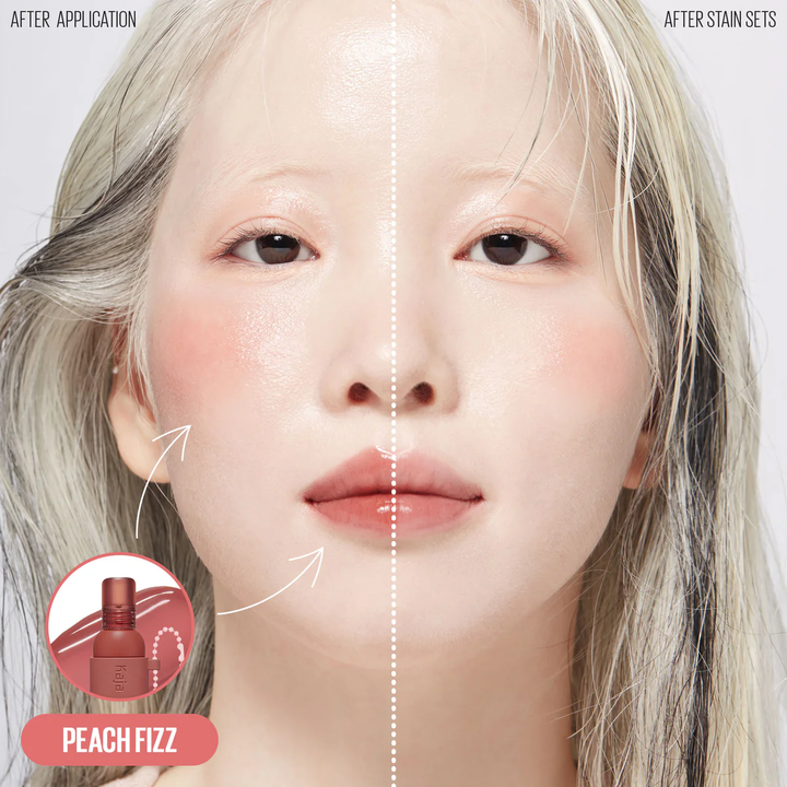 - توزيع المنتج بشكل نقاط على كلًا من الشفاه والخدين بالأداة المرفقة والدمج باستخدام الأصابع أو فرشاة المكياج.