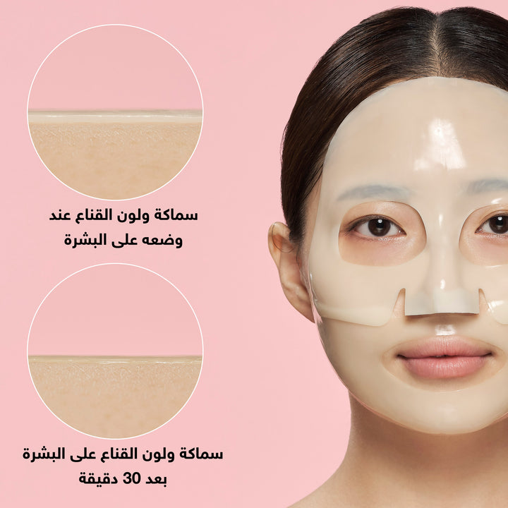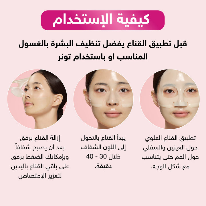 • إزالة القناع برفق بعد أن يصبح شفافًا، والضغط برفق على باقي المنتج باستخدام اليدين؛ لتعزيز الامتصاص.