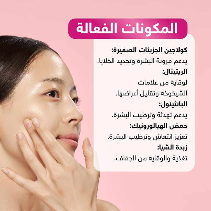 • كولاجين الجزيئات الصغيرة: يدعم مرونة البشرة وتجديد الخلايا.